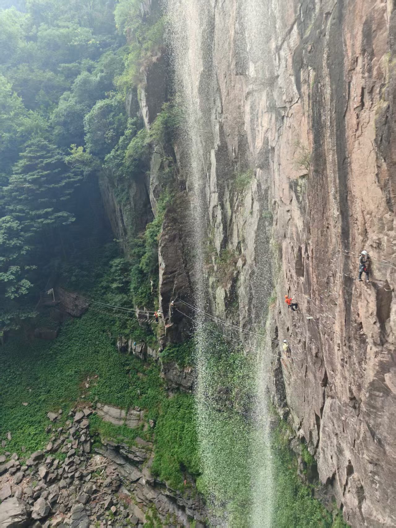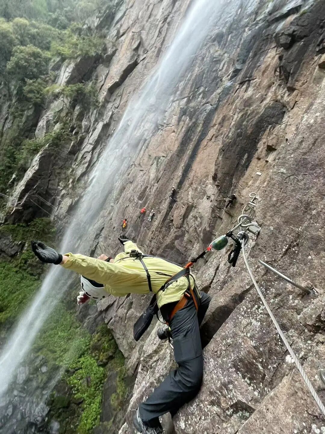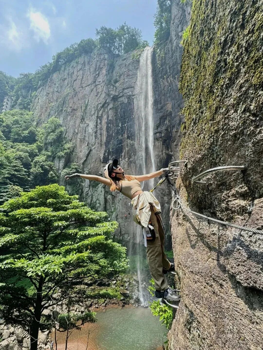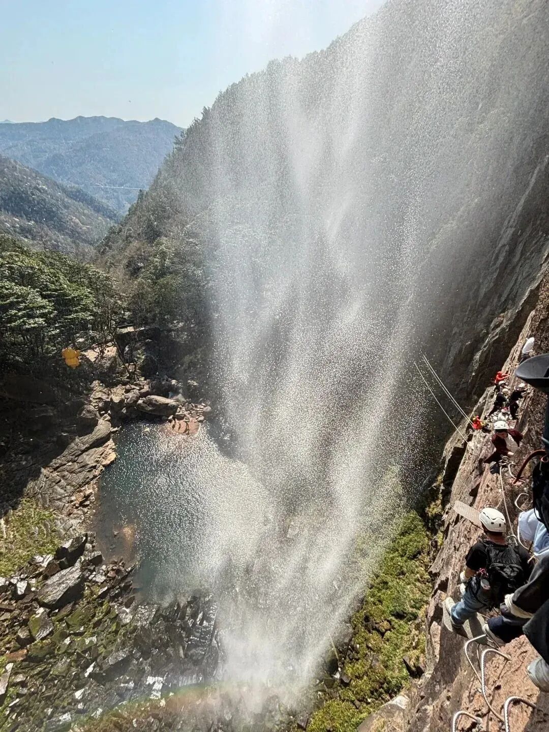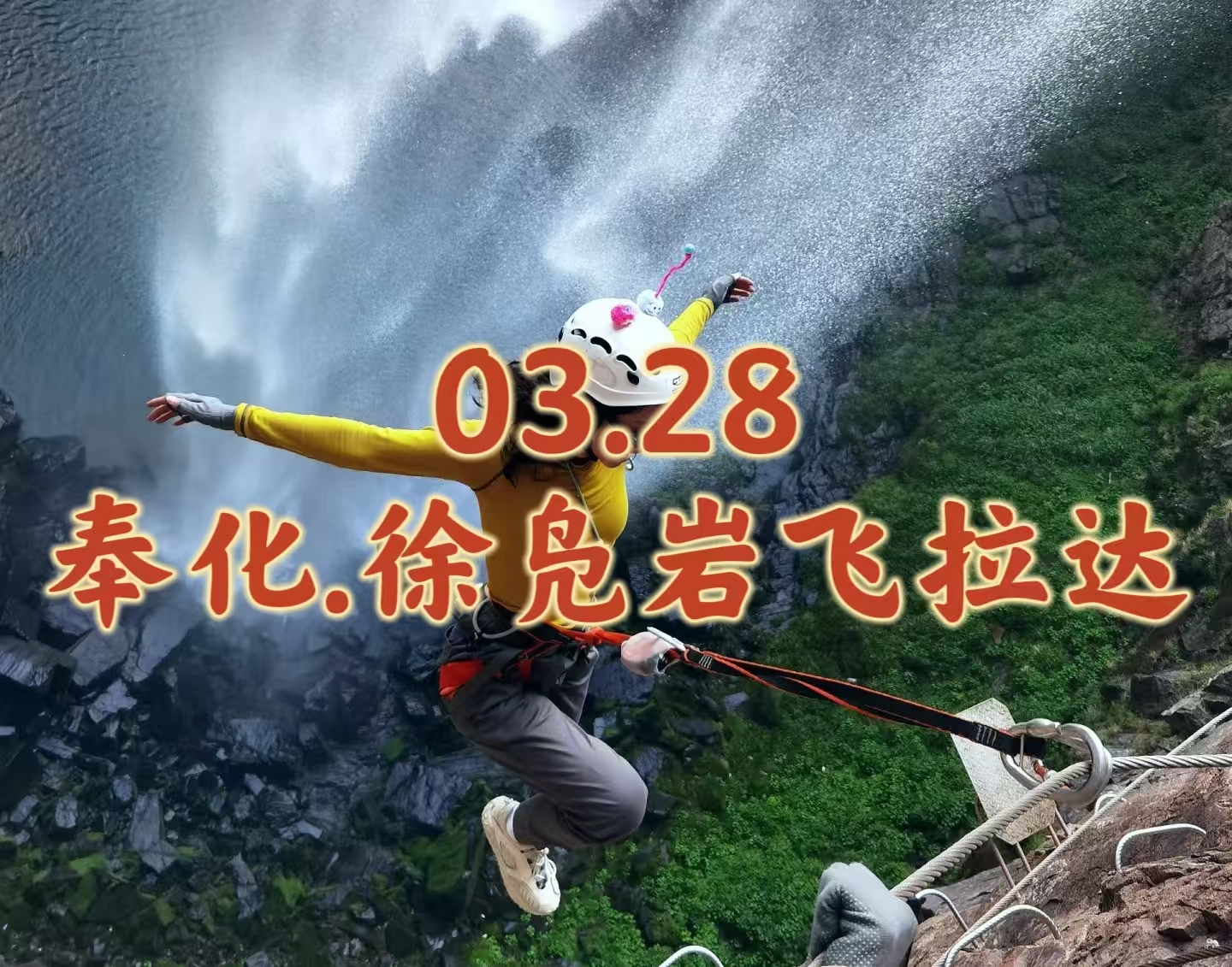 12:00 左右集合进入景区,直接前往飞拉达基地领取装备,出发前教练统一讲解装备和安全注意事项,激情飞拉达,绝壁上的舞蹈,感受飞檐走壁肾上腺素飙升。飞拉达C线,横跨瀑布的穿越线,位于徐凫岩瀑布彩虹潭之上80米处,感受透过瀑布看风景的奇妙体验,更有可能触摸彩虹哦,全程180米,平均高度60米,攀岩时间大约150分钟。结束后如有时间可以自行游玩景区,换一个角度欣赏徐凫岩瀑布的雄伟气势,或体验玻璃栈道、丛林穿越等自费景区项目。也可以回到景区门口的草坪上,安静的享受慢速的时光。(飞拉达项目特殊,有可能出现各种导致耽误行程时间的状况,望见谅)