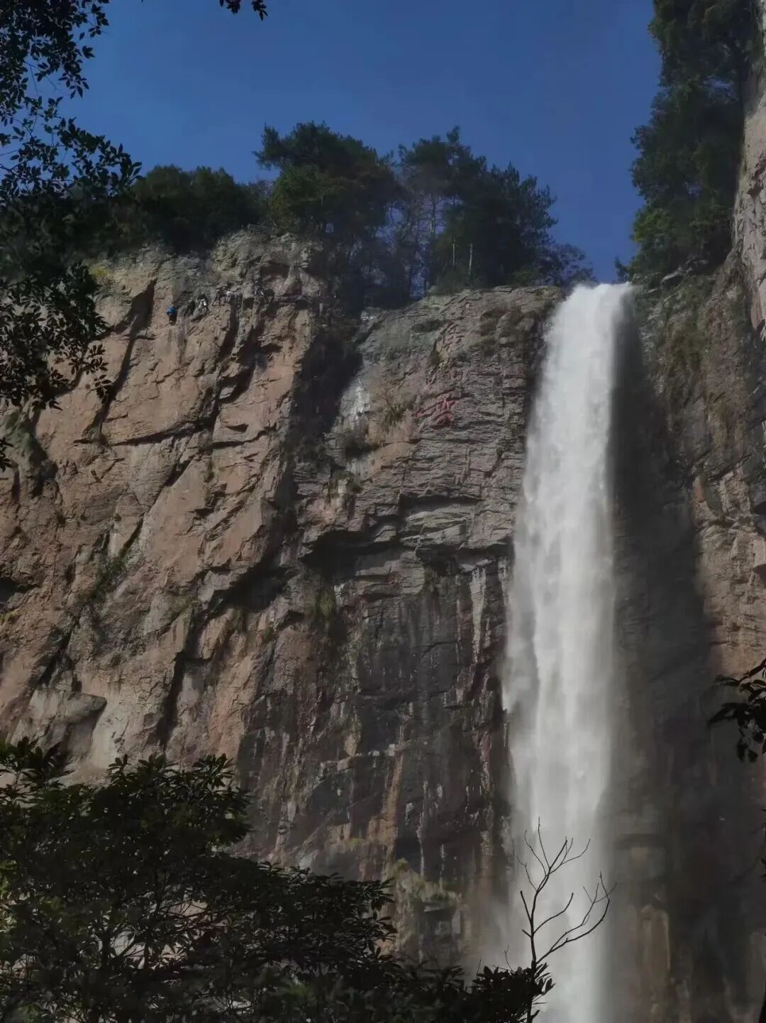 11:00 到达徐凫岩景区。徐凫岩岩顶海拔476米,岩口巨石外突.瀑布落差242米,旁边建有“观瀑亭“和“会仙亭”。石壁上有全国政协副主席、民革中央主席屈武手书“徐凫溅雪“四字,概括了徐凫岩景点的神韵风采。在这里我们先享用午餐,吃饱力气才能更好的体验飞拉达。